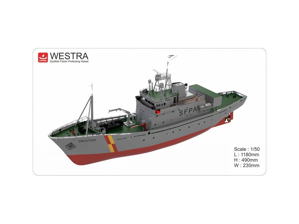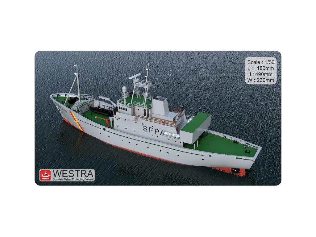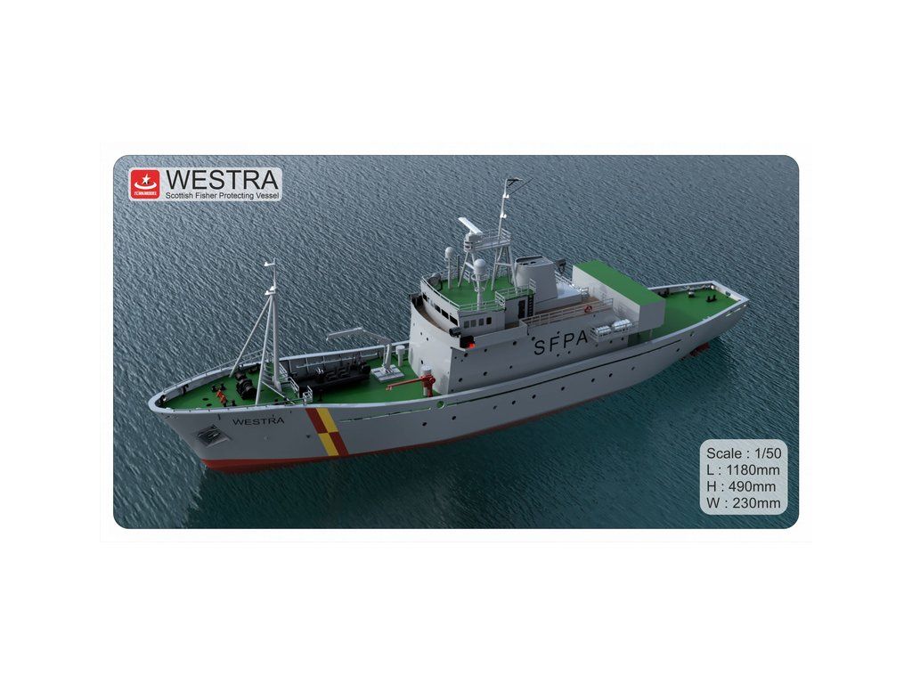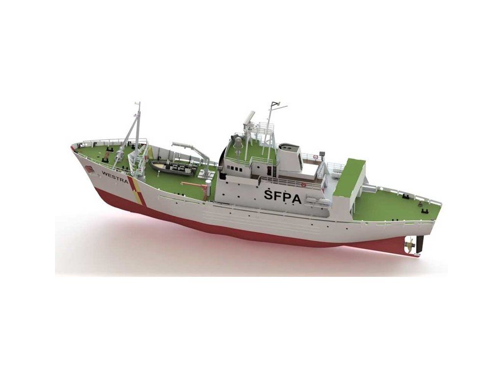 Stavebnice modelu hlídkového člunu FPV Westra od Türkmodel v měřítku 1:50. Pro pokročilé modeláře. Dřevěný trup z laserem vyřezaných dílů, doplněné o detaily z resinovaného 3D tisku. Statický model, lze rozšířit o RC vybavení, pro plavbu.