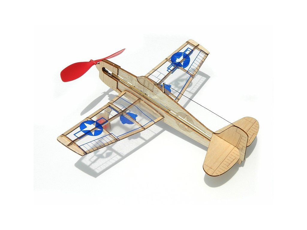 Rychlostavebnice stínové polomakety F6F Hellcat o rozpětí 260mm s pohonem gumovým svazkem z laserem vyřezávaných balsových dílů.