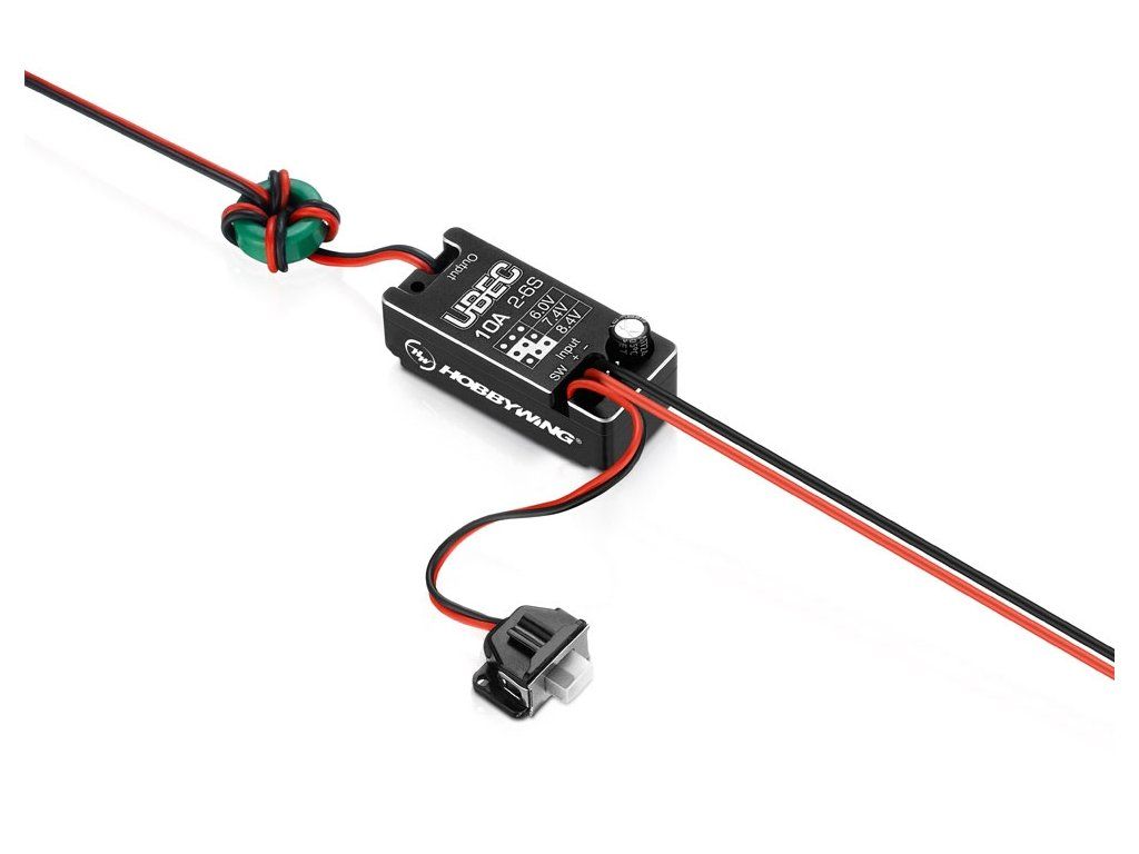 UBEC 10 A je spínaný stejnosměrný stabilizátor napájení; napájí se z 2-6S LiPo akumulátoru, vstupní napětí sníží na úroveň vhodnou pro napájení přijímačů a palubní elektroniky RC modelů a výstupní napětí stabilizuje na nastavené hodnotě (6,0 V, 7,4 V nebo 8,4 V). Zatížitelnost UBEC je 10 A trvale, 15 A špičkově. Díky vodotěsné a prachotěsné skříňce tomu je vhodný především pro modely terénních aut, ale také lodě, tanky apod.