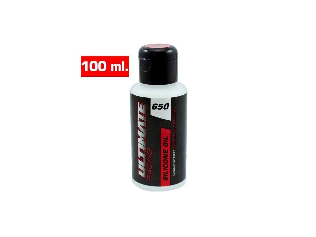 Jedná se o 100 ml lahvičku silikonového oleje Ultimate Racing 650 cSt, který se používá do olejových tlumičů. Tlumičový olej Ultimate Racing je vyroben ze 100% čistého silikonového oleje a v horkém počasí nezřídne a v chladném počasí nezhoustne. Čím vyšší je viskozitní číslo oleje, tím je olej hustší. Silikonový olej Ultimate Racing obsahuje aditiva proti tření, která zajišťuje životnost tlumičů a minimalizují změny viskozity.