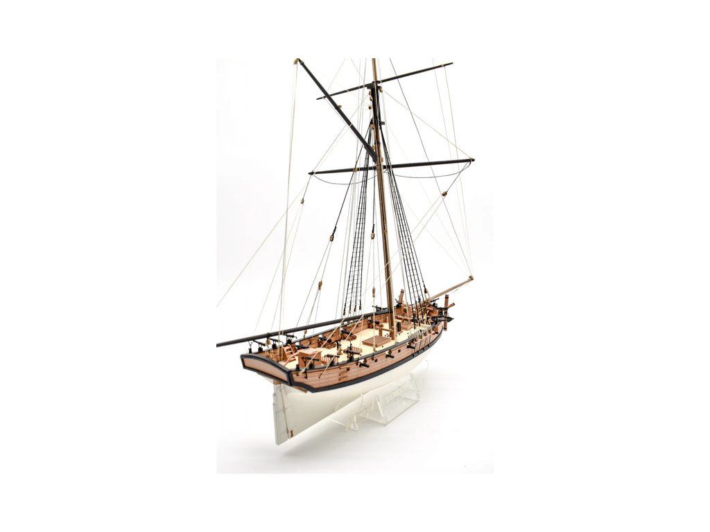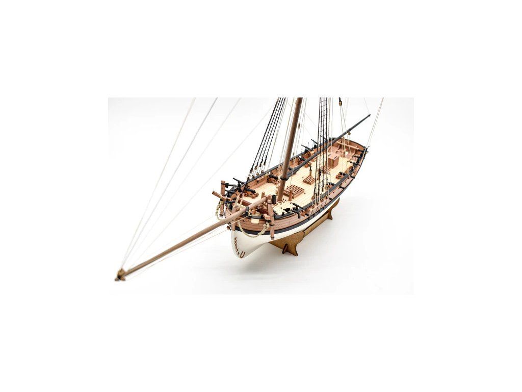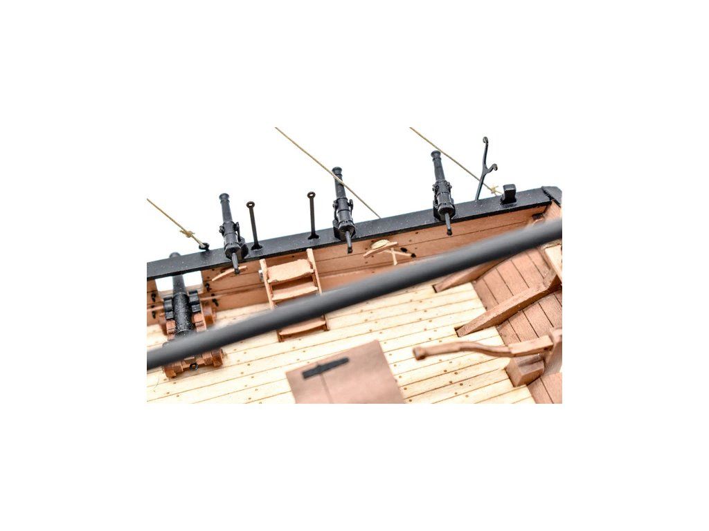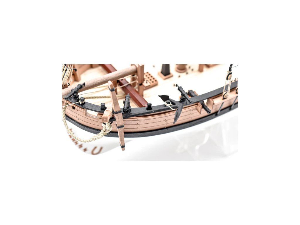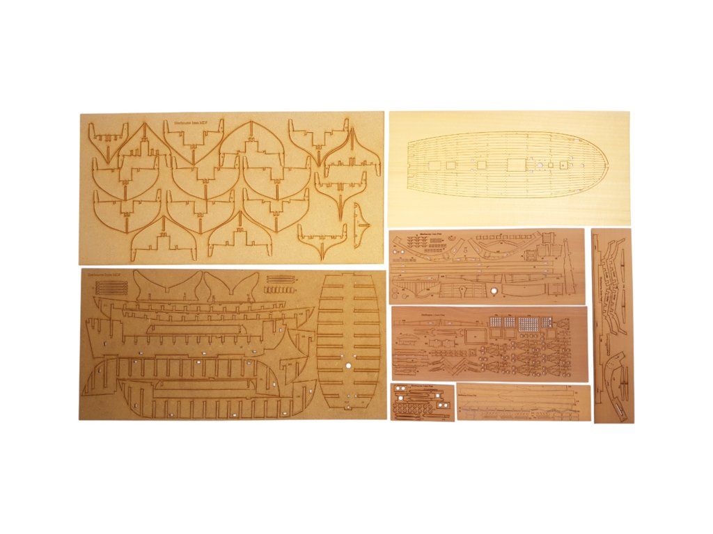 Balení obsahuje laserem řezané a gravírované díly vyrobené z MDF a hruškového dřeva, laserem gravírovaná a řezaná deska z lipového dřeva s detaily hřebíků, 2 mosazné destičky s fotoleptanými díly, 3D tištěné díly s vysokým rozlišením, dvouplaňkový trup je z lipového a hruškového dřeva (druhá obšívka), kulaté lišty z ořechového dřeva pro stěženě, ráhna a výložník. Několik velikostí černě a přírodně zbarvené nitě pro lanoví, stejně jako všechny potřebné součásti. Komplexní, barevný návod k použití spolu s 19 plánky obsahujícími všechny výkresy včetně stěžnů a lanoví - manuál EN.
