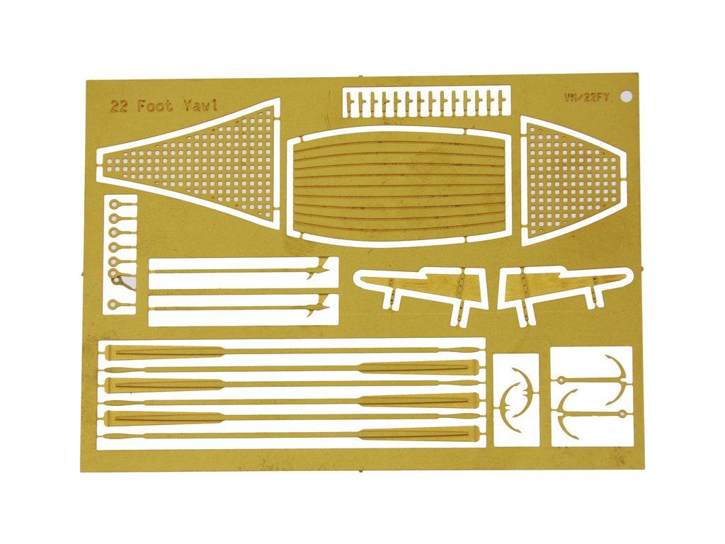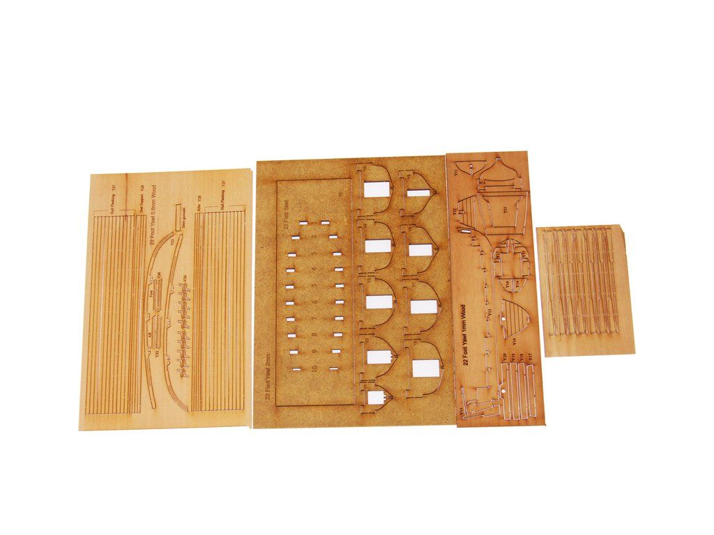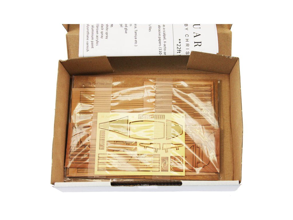Balení obsahuje sadu překližkových dílů, sadu mosazných plošných dílů, sadu výkresů a manuál EN.