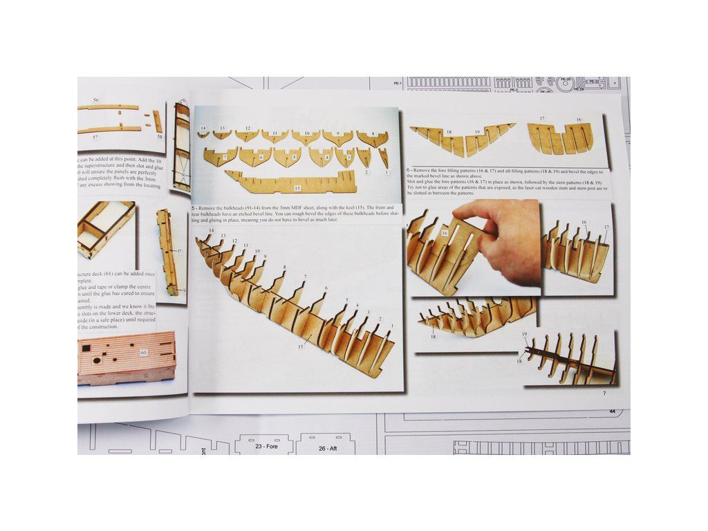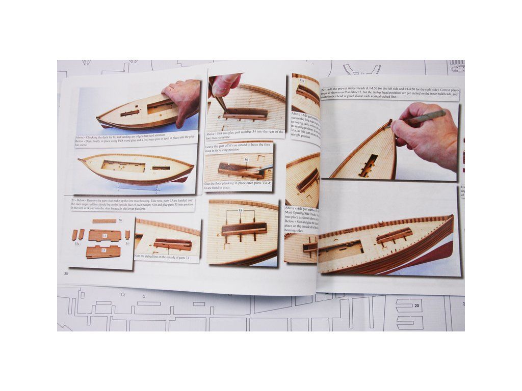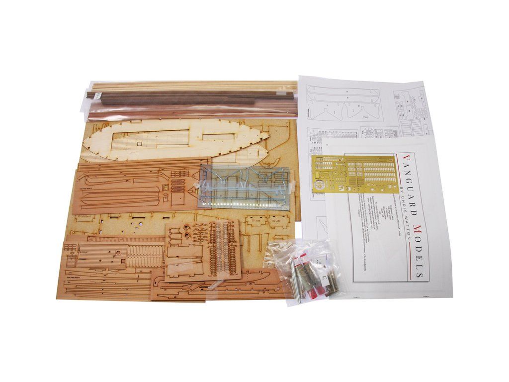 Balení obsahuje sadu překližkových dílů, sadu dřevěných lišt o různém průřezu, sáčky s drobnými díly, díly z mosazi, plastový stojánek, sadu výkresů, český a anglický manuál s fotografiemi jednotlivých stavebních kroků.