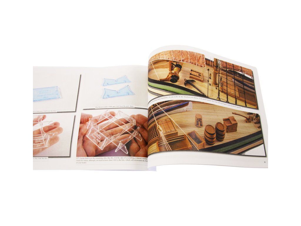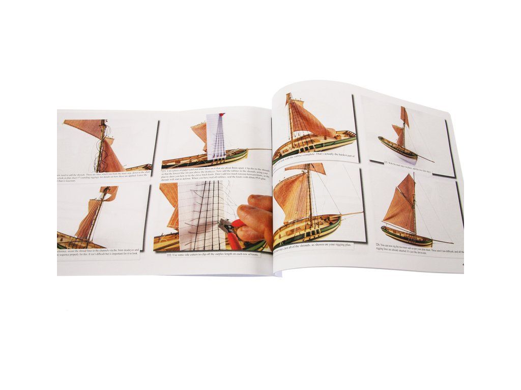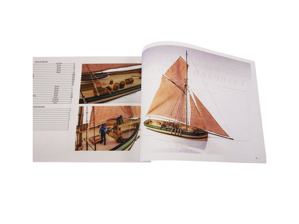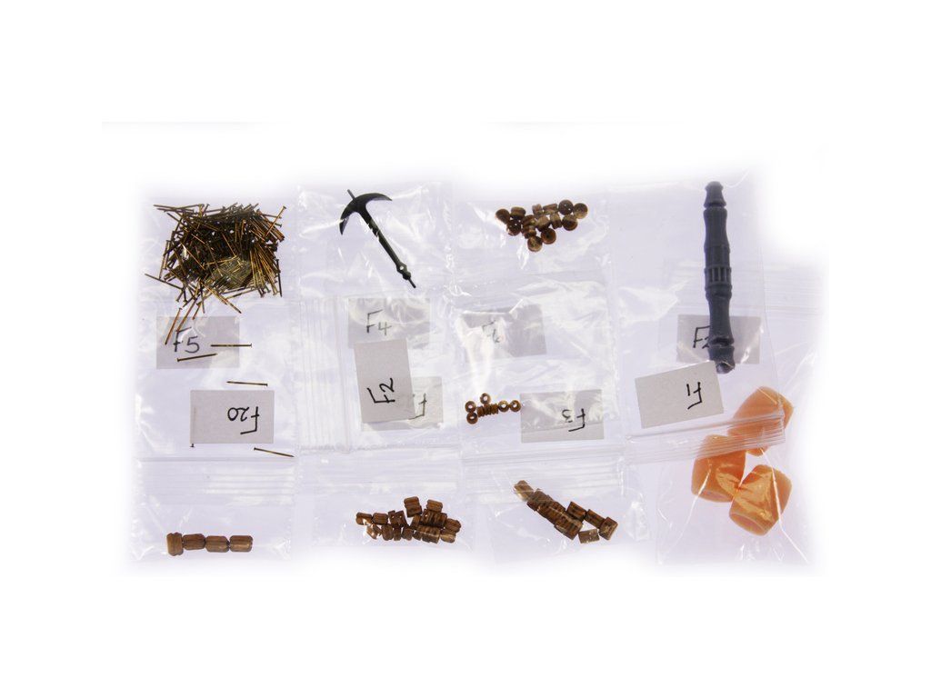 Balení obsahuje sadu překližkových dílů, sadu dřevěných lišt o různém průřezu, sáčky s drobnými díly, díly z mosazi, lanoví, sadu výkresů a vícejazyčný manuál EN.