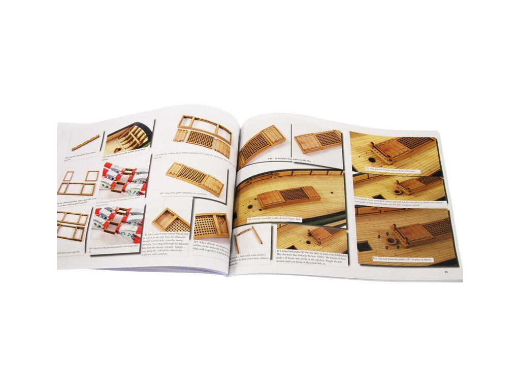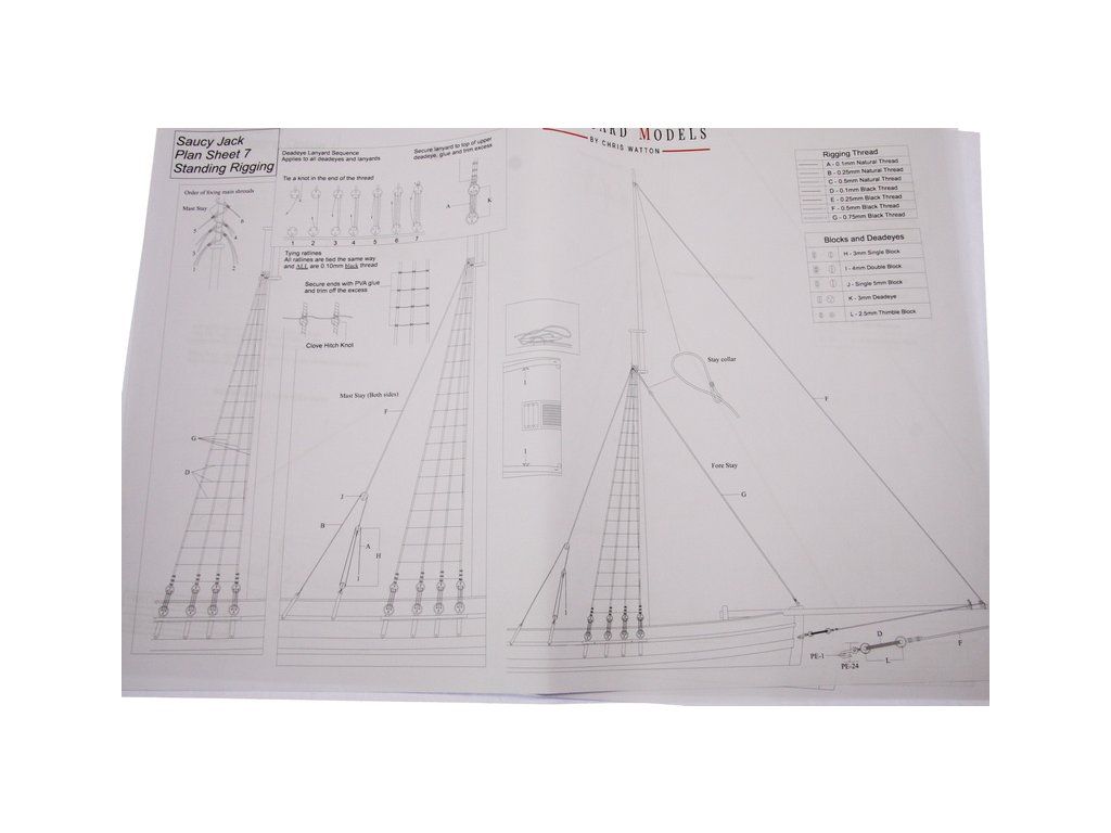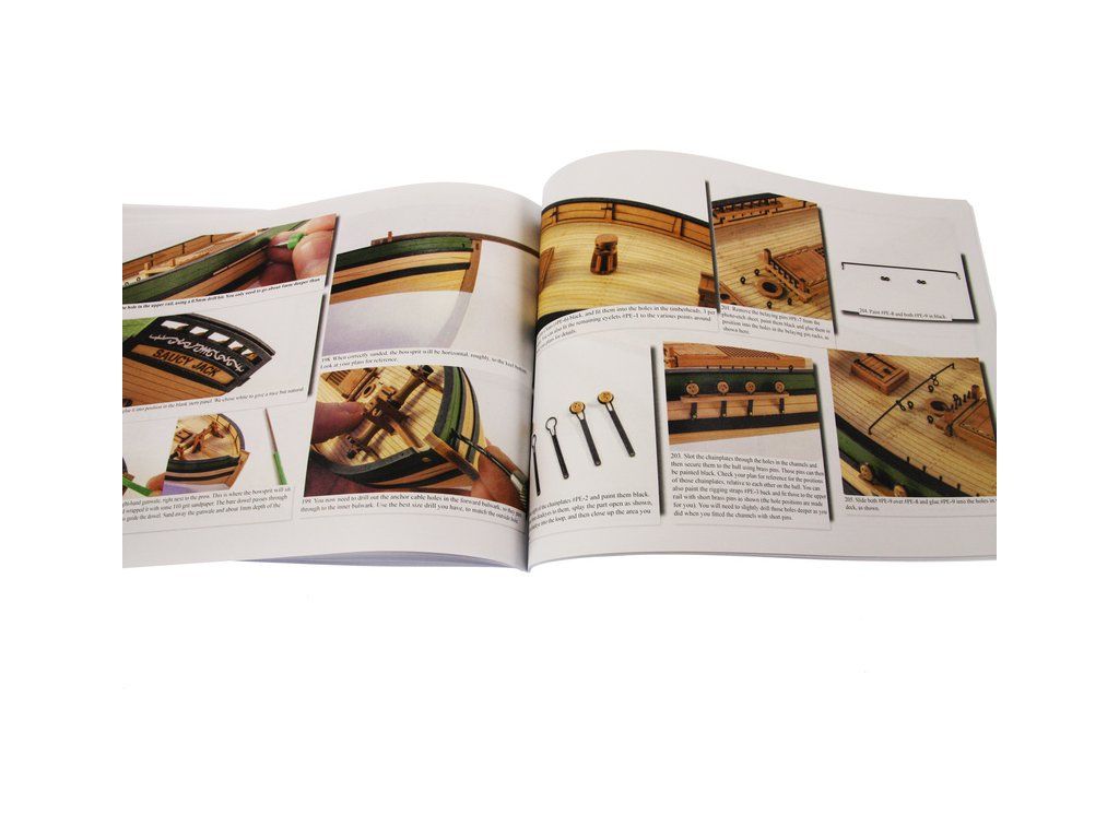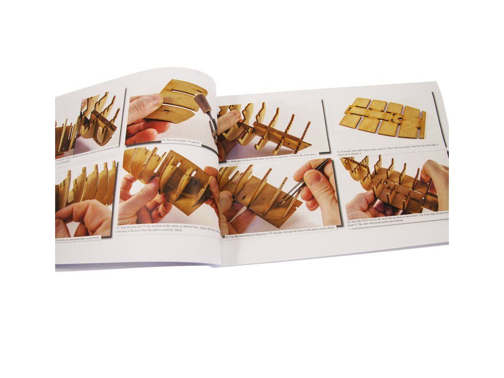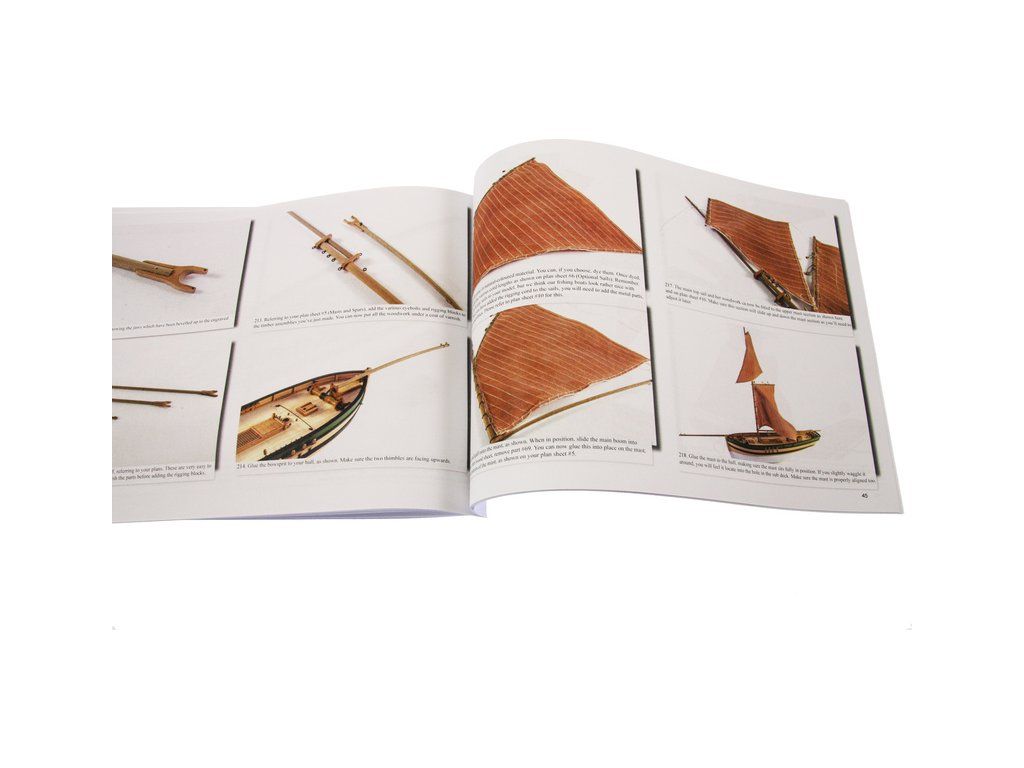 Balení obsahuje sadu překližkových dílů, sadu dřevěných lišt o různém průřezu, sáčky s drobnými díly, díly z mosazi, lanoví, sadu výkresů a vícejazyčný manuál EN.