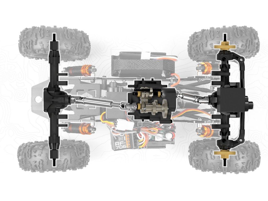 Pevný 2mm hliníkový podvozek, centrální servem ovládaná převodovka half-DIG, vyhlazená spodní strana, přední převodovka s overdrive a přidané nízko namontované mosazné komponenty společně poskytují působivou ovladatelnost a trakci v kompaktním balení.