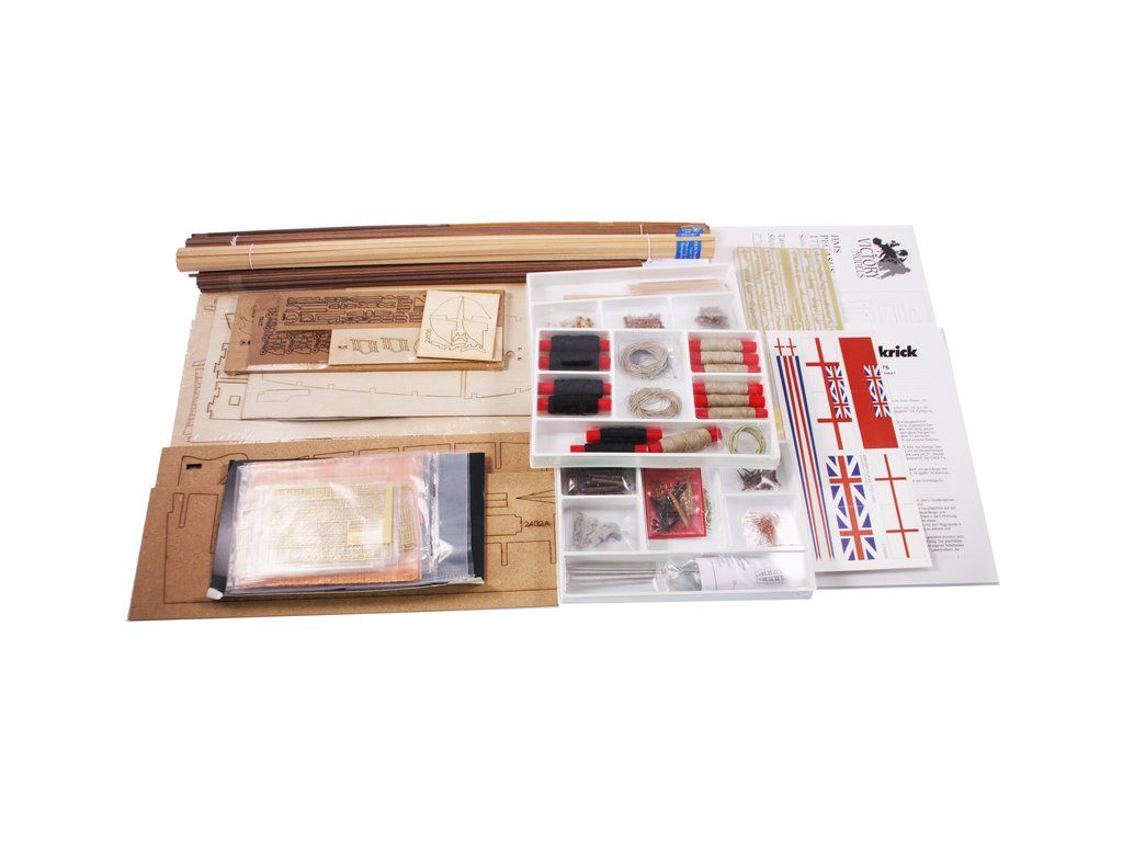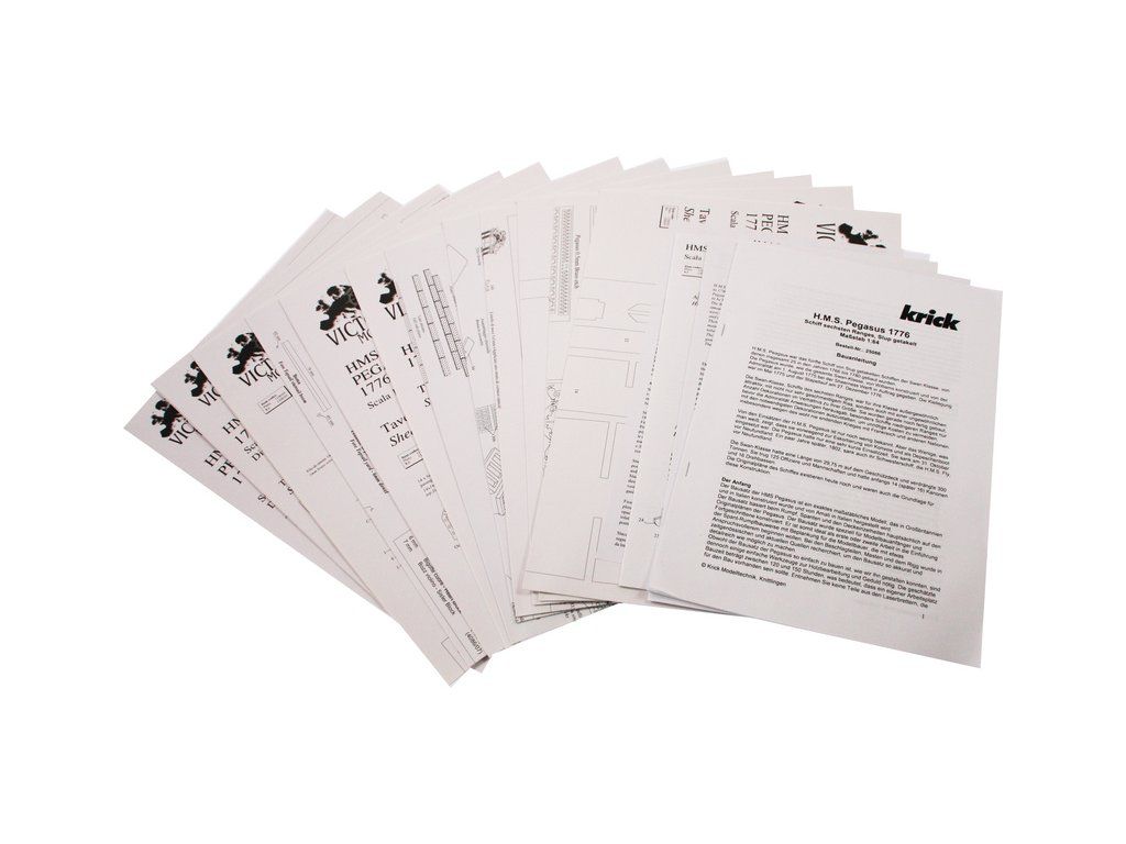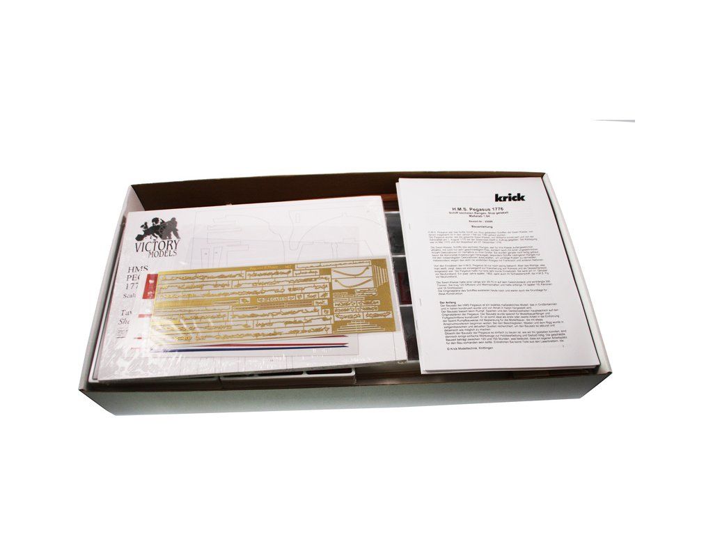 Obsahem balení je stavebnice lodi VICTORY MODELS H.M.S Pegasus 1776 1:64 kit. Balení obsahuje sadu překližkových dílů, sadu dřevěných lišt o různém průřezu, blistr s drobnými díly, díly z mosazi, sadu výkresů a vícejazyčný manuál.