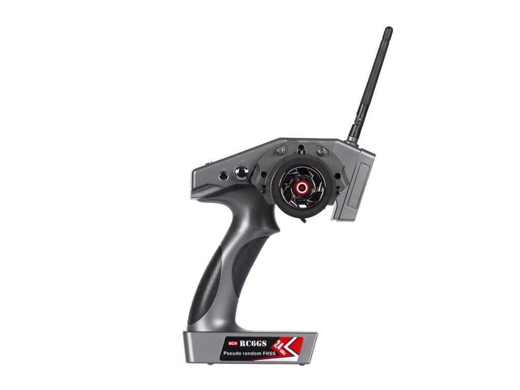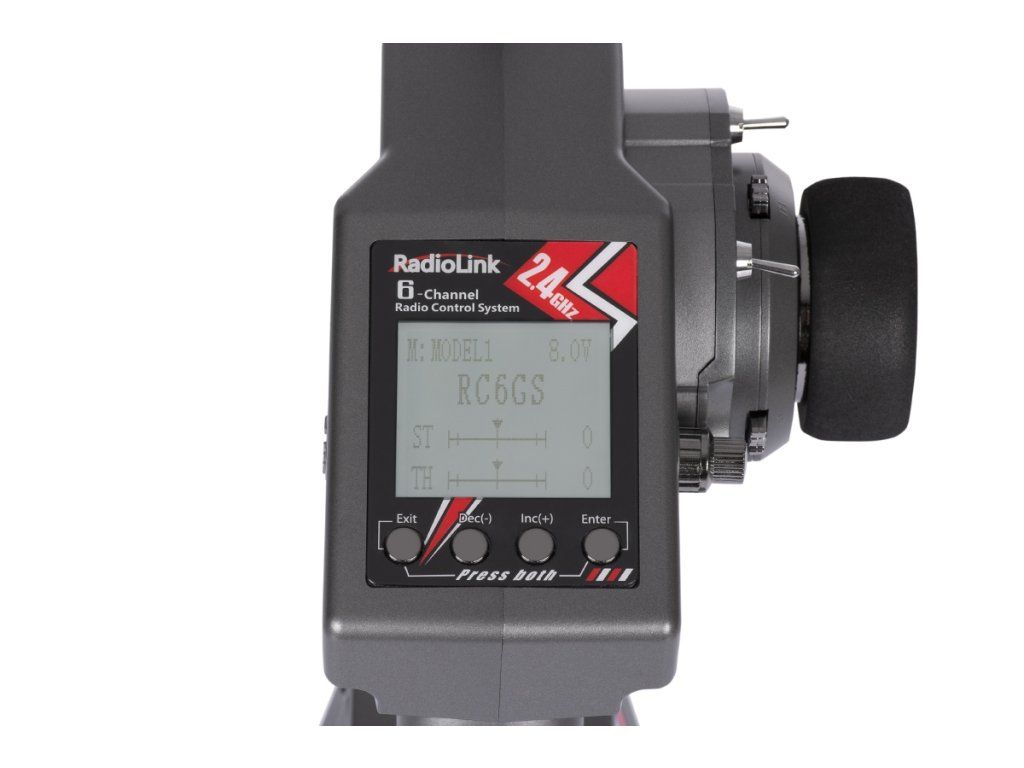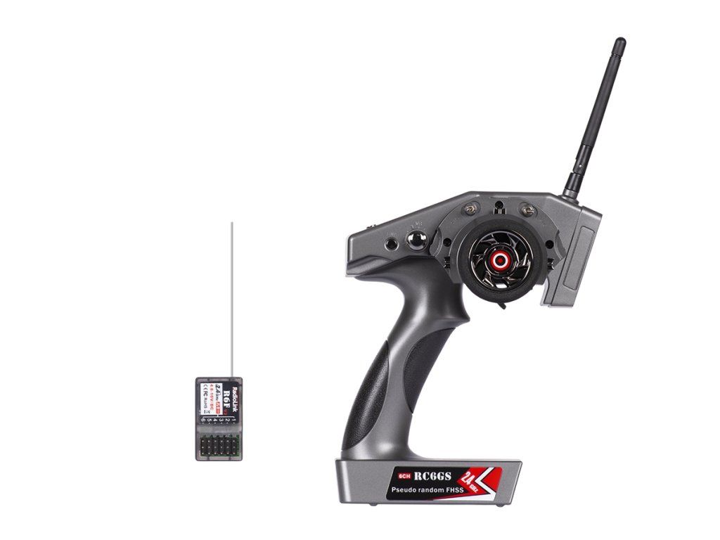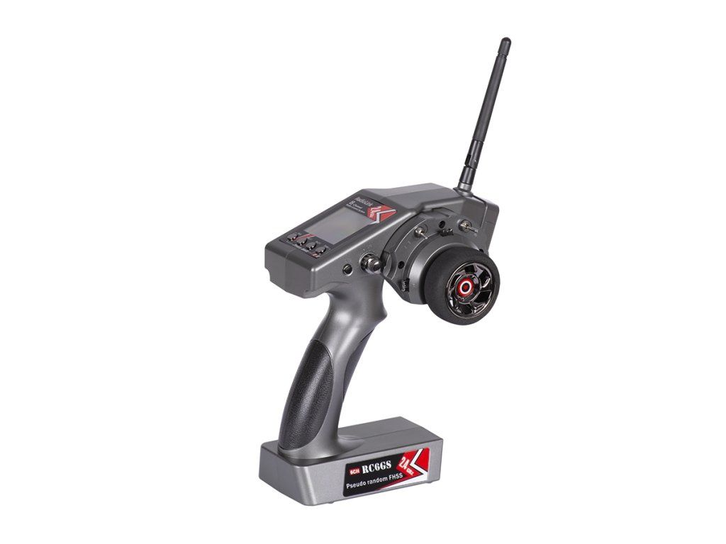 Vysílač RC6GS V3 v klasickém volantovém designu s rukojetí dobře padnoucí do ruky je vybaven volantovým ovladačem řízení, spouští pro ovládání plynu, otočným knoflíkem pro třetí kanál, třemi digitálními trimy okolo volantu (pro kanály 1-3), dvěma páčkovými třípolohovými přepínači a dvěma tlačítkovými přepínači. K programování slouží čtveřice tlačítek; snadnou orientaci v intuitivním menu zajišťuje LCD displej. RC6GS V3 má paměť pro 30 modelů a širokou škálu programových funkcí včetně dvou volně programovatelných mixů, takže snadno zvládnete nastavit běžné i speciální modely aut (např. řízená přední i zadní kola pro crawlery, pásová vozidla, dvouhřídelové lodě apod.).