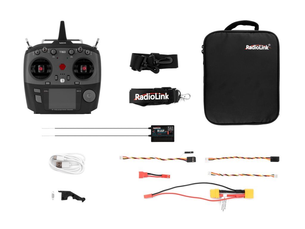 Programové vybavení:T16D nabízí programy pro osm typů modelů - klasická letadla, samokřídla/delty, multikoptéry, vrtulníky, auta, lodě, pásová vozidla/tanky a roboty, přičemž nabízí možnost spolupráce s řídícími jednotkami RadioLink pro letadla, drony, vozidla nebo třeba zavážecí lodi pro rybáře včetně příslušné telemetrie.