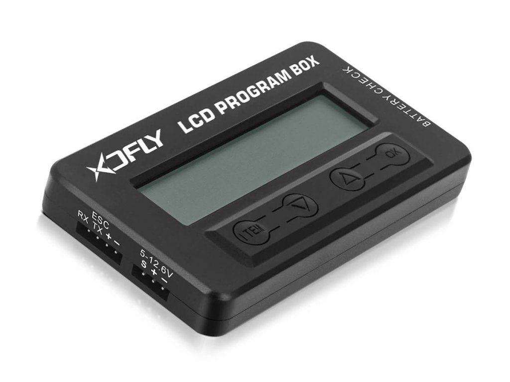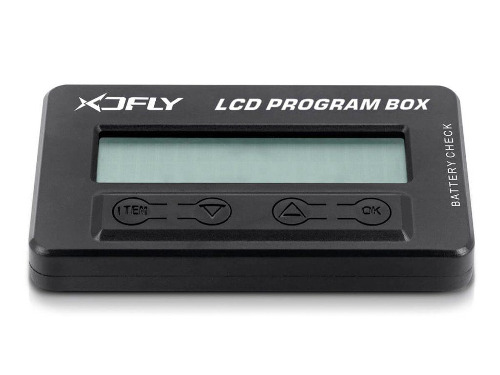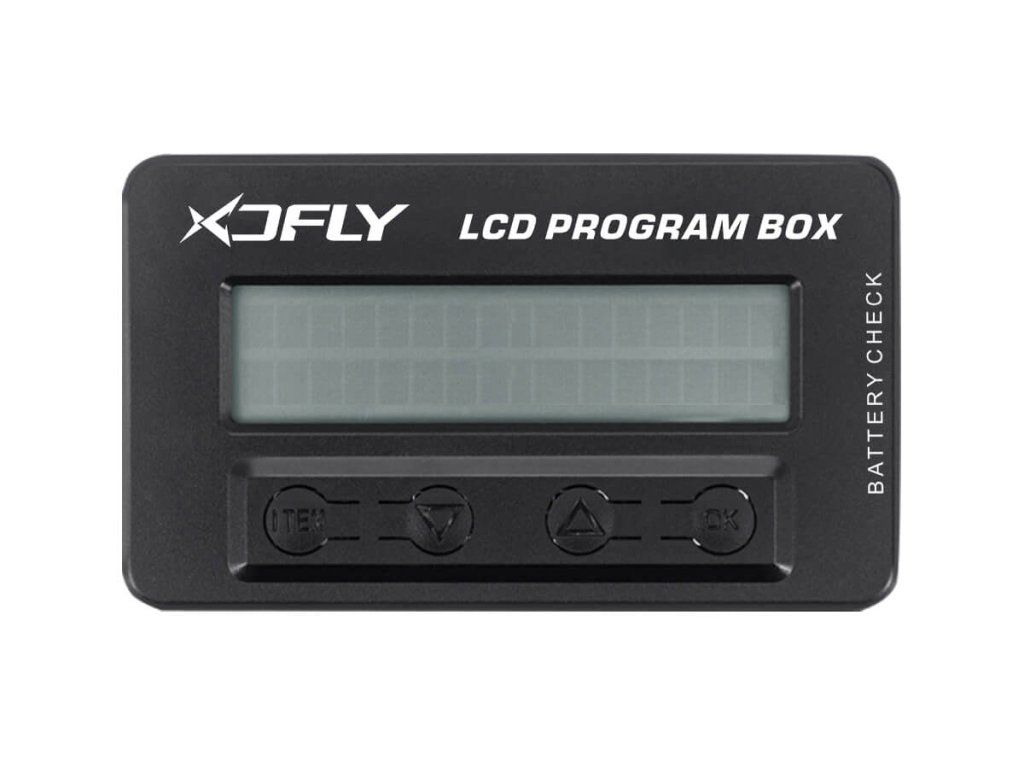 Multifunkční LCD programovací box pro regulátory vybraných řad XDFly slouží ke snadnému a rychlému programování regulátorů - doma „na stole" stejně jako na letišti. Kromě toho může sloužit jako servotester, umí také měřit šířku a frekvenci signálových impulsů např. na výstupu z přijímače. Vybaven je také vstupem umožňujícím měřit celkové napětí a napětí jednotlivých článků lithiových akumulátorových sad 2-8S.