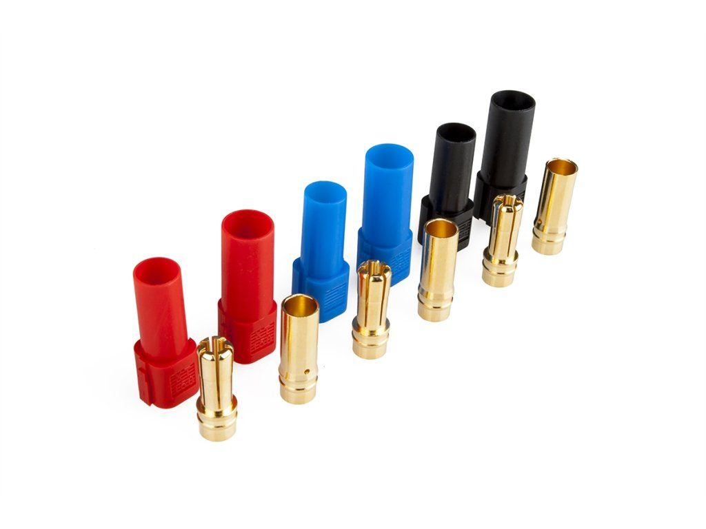 Silový konektor se 6 mm zlacenými kontakty se zatížitelností max. 100 A. Pro kabely o průřezu max. 8,4 mm2 (8AWG). Přechodový odpor 0,20 mOhm, max. 500 V. Balení 3 páry kontaktů s pouzdry v barvě červené, černé a modré.Doplňkové parametry